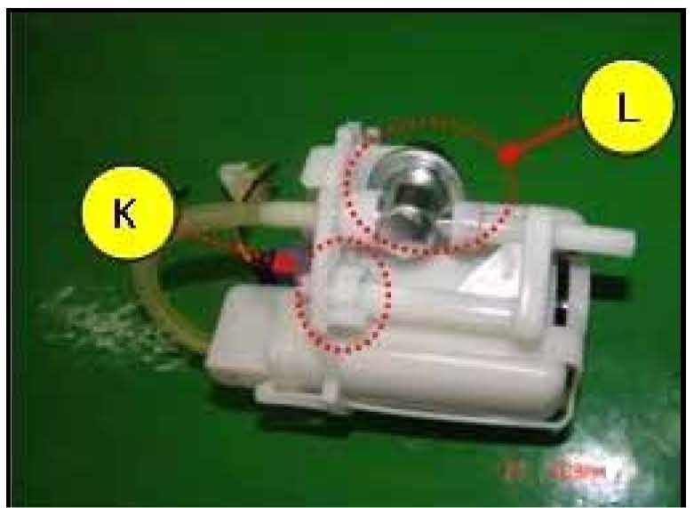13. Remove the fuel pressure regulator (L) by releasing the holding hook (K).