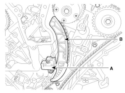 Install the LH timing chain tensioner arm (B) and LH timing chain auto tensioner (A).