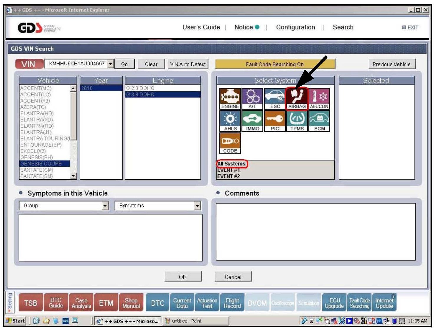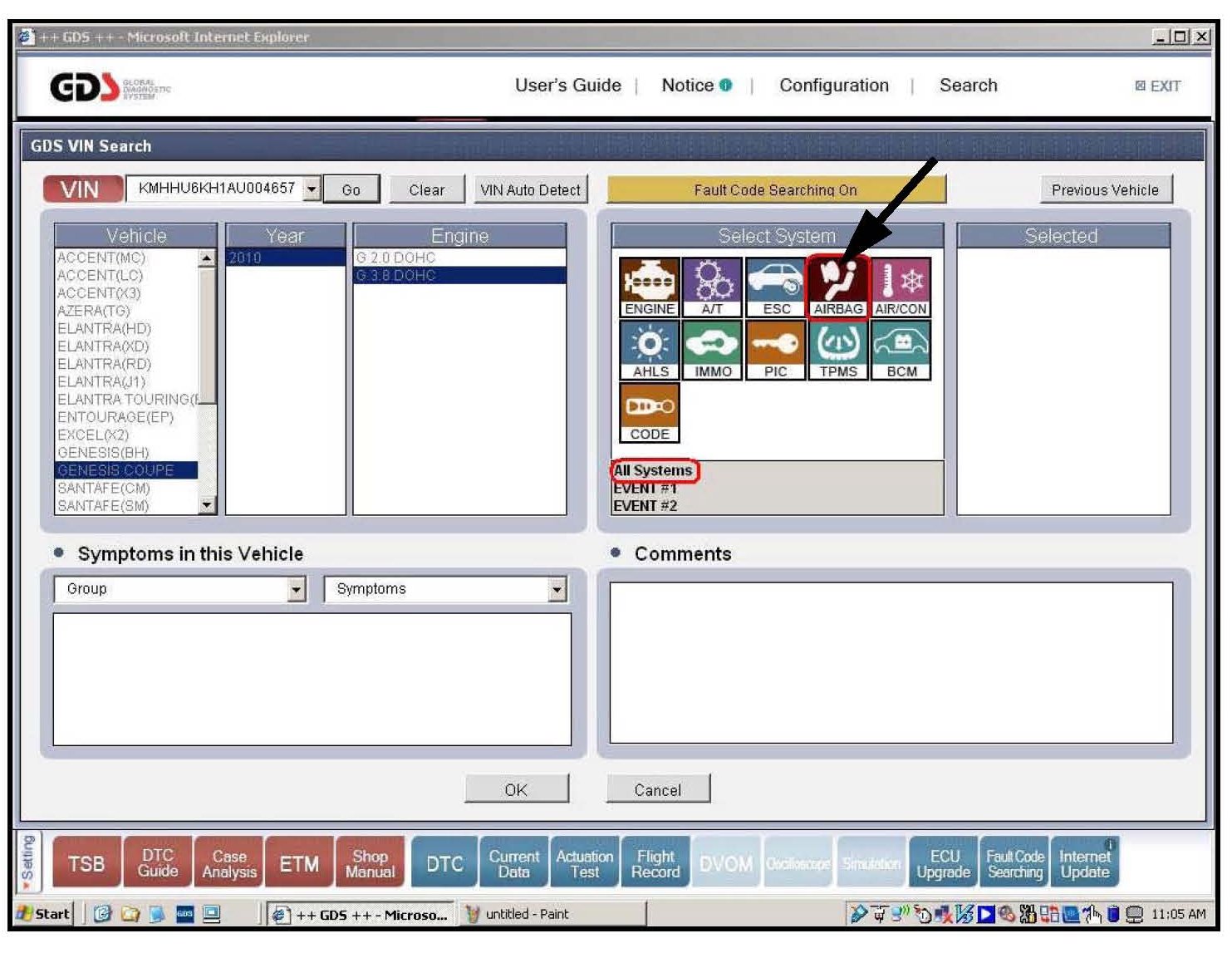 4. Connect the GDS unit to the vehicle, select the vehicle model and then select the "AIRBAG" icon.
