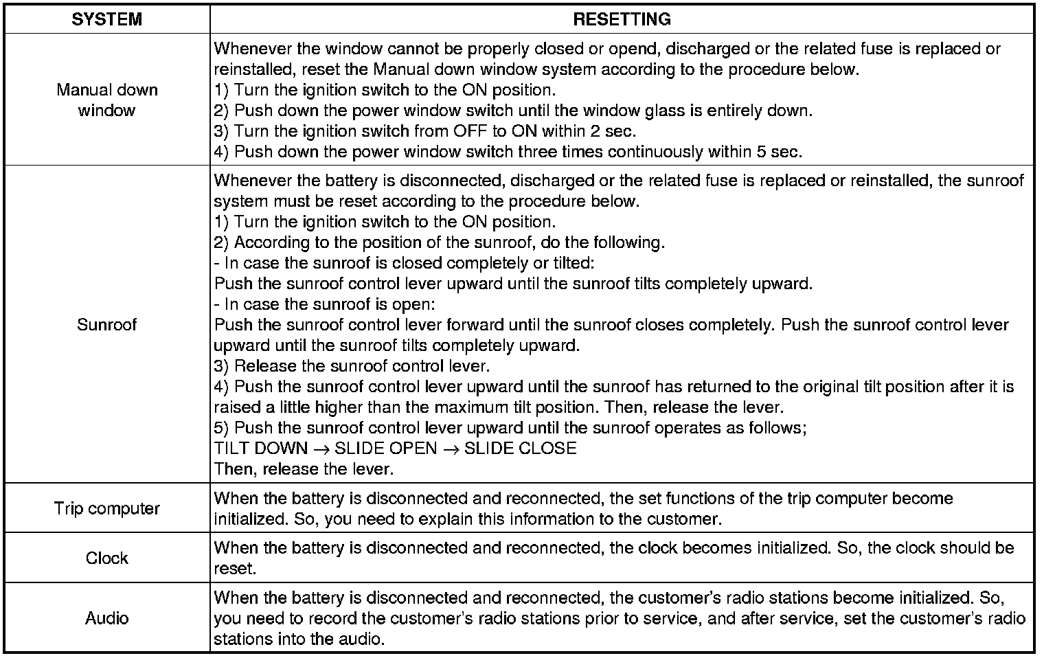 When reconnecting the battery cable after disconnecting, recharging battery after discharged or installing the memory fuse located on the driver's side panel after removing, be sure to reset systems mentioned on the below table.