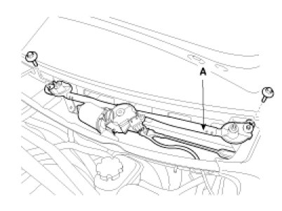 6. Remove the windshield wiper motor and linkage assembly(A) after removing 2 bolts.