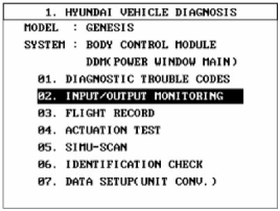 4. Select "Input/output monitoring", if you will check current data of power door lock system. It provides input/output status of DDM/ADM.