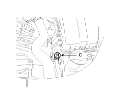1. Connect an R-134a refrigerant Recovery/Recycling/Charging System (A) to the high-pressure service port (B) and the low-pressure service port (C) as shown, following the equipment manufacturer's instructions.