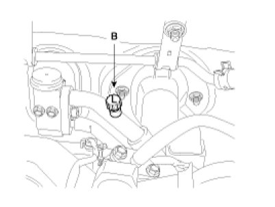 1. Connect an R-134a refrigerant Recovery/Recycling/Charging System (A) to the high-pressure service port (B) as shown, following the equipment manufacturer's instructions.