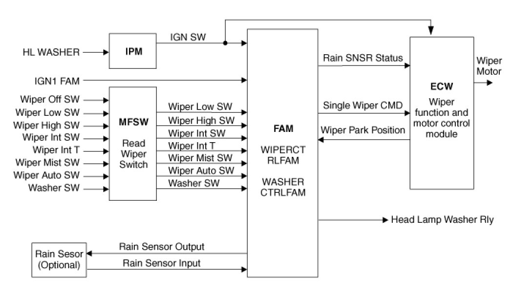 2. The FAM transmits a single wiping command whenever rain has been detected(Rain Detected signal from Rain sensor) and the wiper switch is moved to the AUTO position. But The FAM does not transmit single wiping command when the wiper switch is moved to the AUTO position and OFF signal is being received from Rain sensor. But if the wiper switch is moved to AUTO position for the first time since vehicle ignition switch is turned on then the FAM transmits single wiping command regardless of Rain Detected or OFF signal.