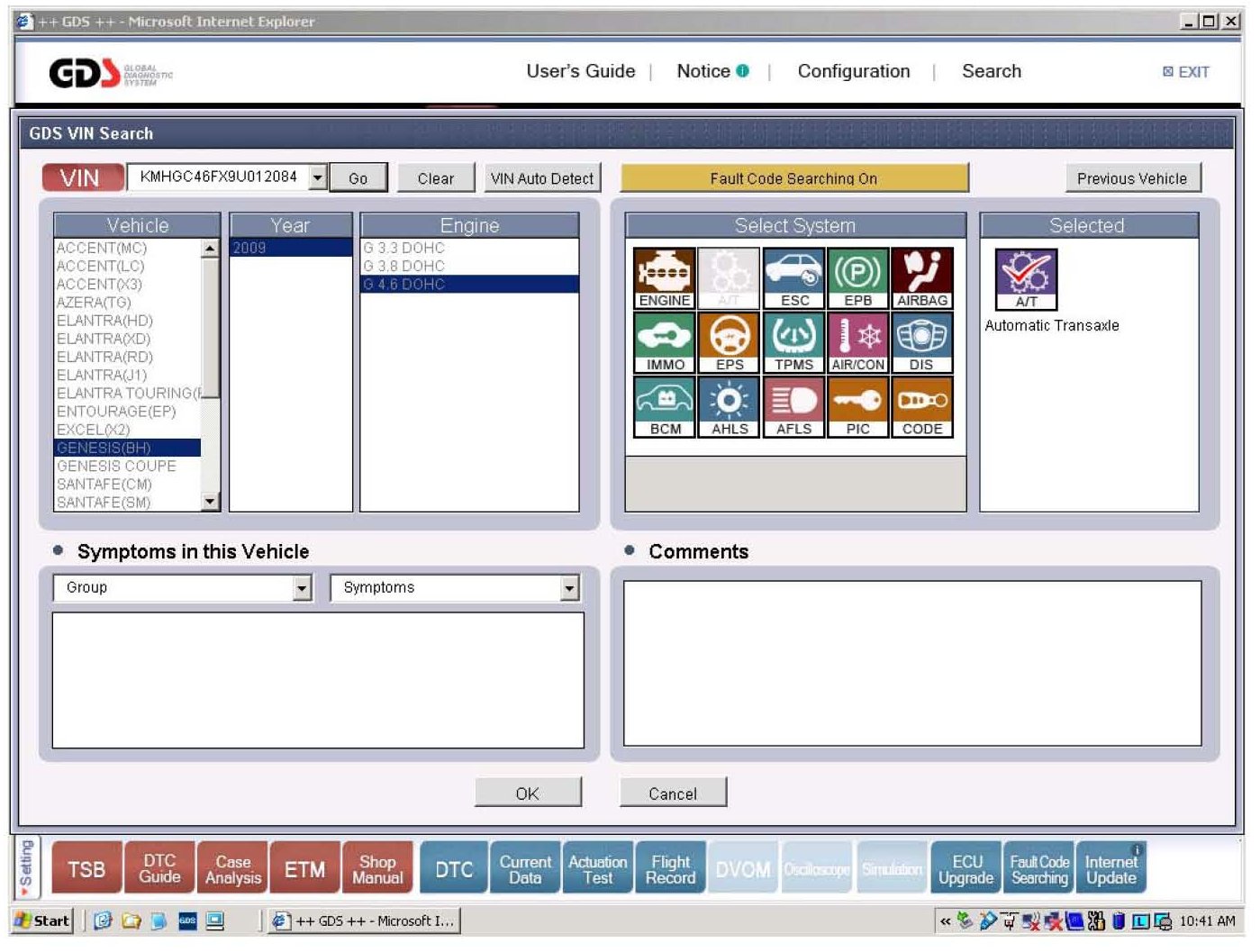 1. Select the vehicle information and A/T as the system and then click OK.
