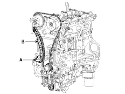 Install timing chain tensioner arm (B).
