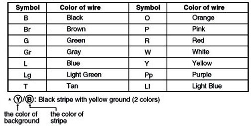 The following abbreviations are used to identify wire colors in the circuit schematics.