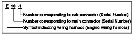 A Connector identification symbol consists of a wiring harness location classification symbol corresponding to a wiring harness location and number corresponding to the connector.