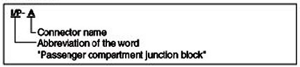A junction block identification symbol consists of a wiring harness location classification symbol corresponding to a wiring harness location and number corresponding to the connector in the junction block.