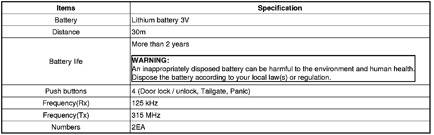 Keyless Starting System: Specifications