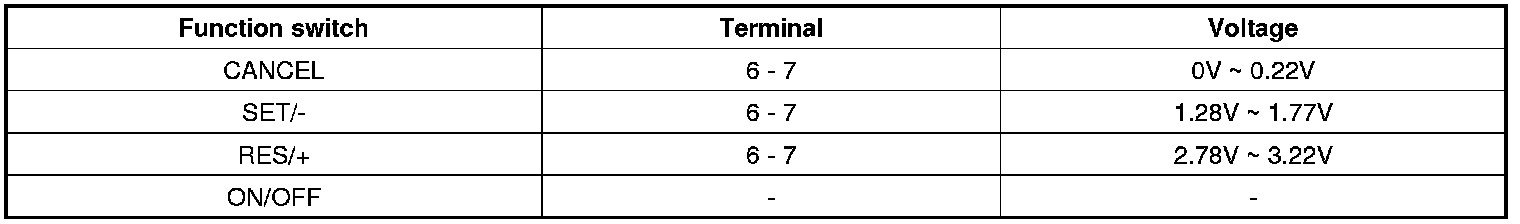 2. Measure voltage between terminals on the harness side connector when each function switch is ON (switch is depressed).