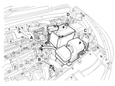 5. Disconnect the battery positive terminal and then remove the battery (D).
