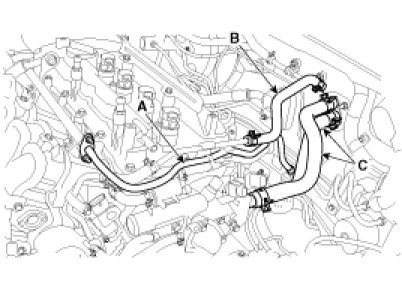 18. Disconnect the fuel hose (A), brake booster vacuum hose (B) and heater hoses (C).