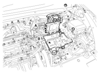 6. Disconnect the ECM connector and then remove the ECM (A) and the battery tray (B).