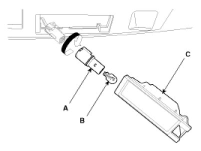 3. Turn the license bulb socket (A) counterclockwise to remove the bulb (B) from lens (C).