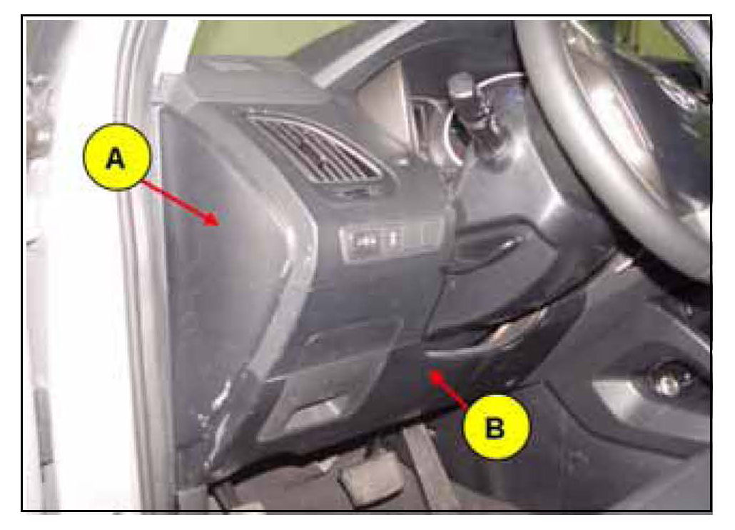 2. Using a flat blade screwdriver, carefully remove the left crash pad side cover (A). Using a Phillips screwdriver, remove the four screws and remove the crash pad lower panel (B).