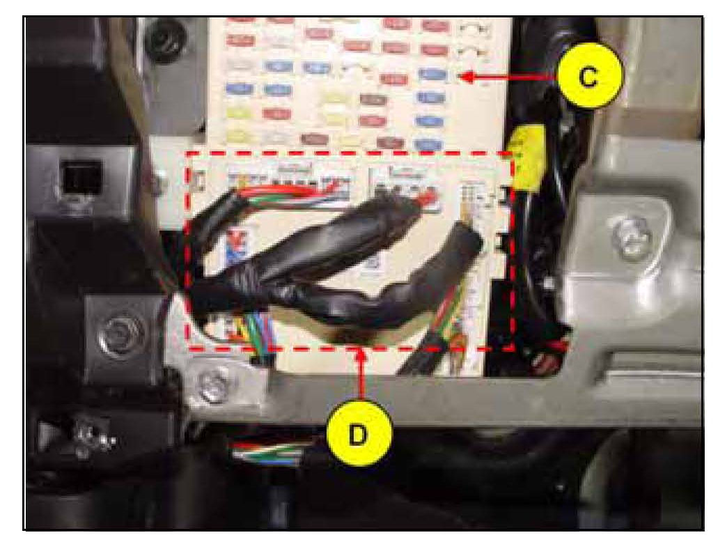 3. Disconnect the five (5) wiring connectors (D) from the front side of the smart junction box (C).