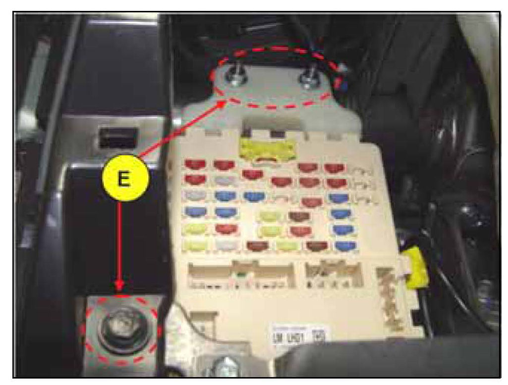 4. Using a 10 mm socket, remove the three (3) smart junction box mounting bolt and nuts (E).