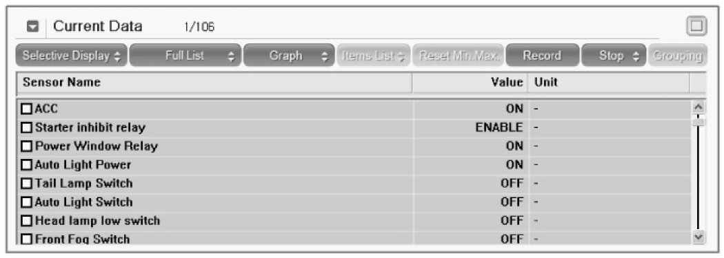 3. To consult the present input/out value of IPM, "Current DATA". It provides information of IPM input/output conditions of power supply, turn signal/brake lamp, headlamp, door locks, outside mirror, wiper, auto-light and transmitters etc.