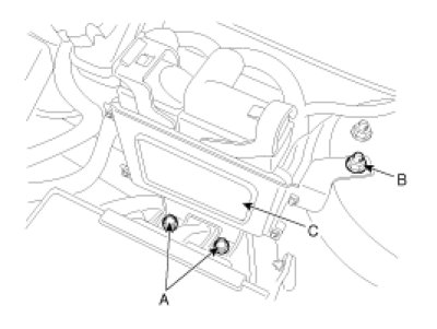 4. Remove the mounting bolts (A) and nut (B), and then remove the TCM (C).