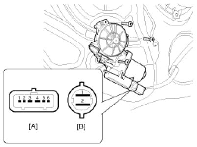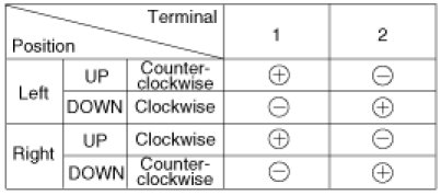 4. Connect the motor terminals directly to battery voltage (12V) and check that the motor operates smoothly. Next, reverse the polarity and check that the motor operates smoothly in the reverse direction. If the operation is abnormal, replace the motor.