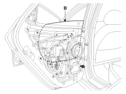 4. Carefully adjust the glass (B) until you can see the bolts, then loosen them. Separate the glass from the glass run and carefully pull the glass out through the window slot.