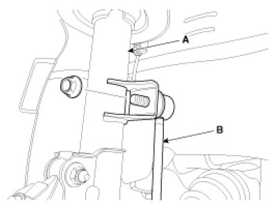 2. Disconnect the stabilizer link(B) with the front strut assembly(A) after loosening the nut.