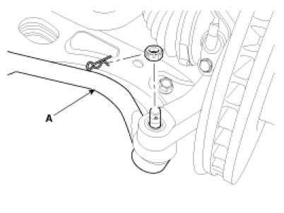 3. Remove the spirit pin and castle nut and then disconnect the tie-rod end(A) from the front knuckle.
