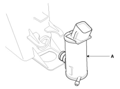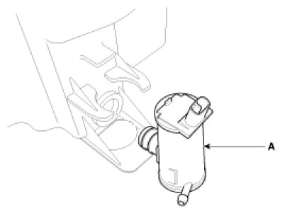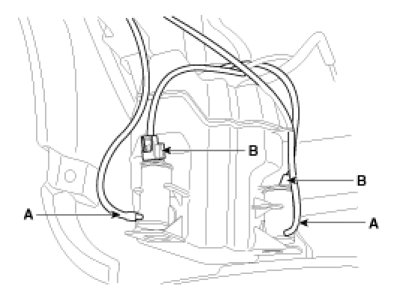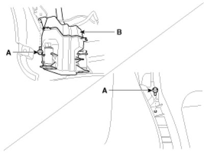 6. Remove the washer reservoir (B) after removing bolts (A).