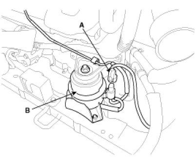 2. Remove the front roll stopper under mounting (B) bolts and disconnect the electronic controlled mounting solenoid connector (A).