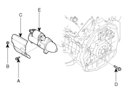 7. Remove the 2 bolts (D) holding the starter, then remove the starter (E).