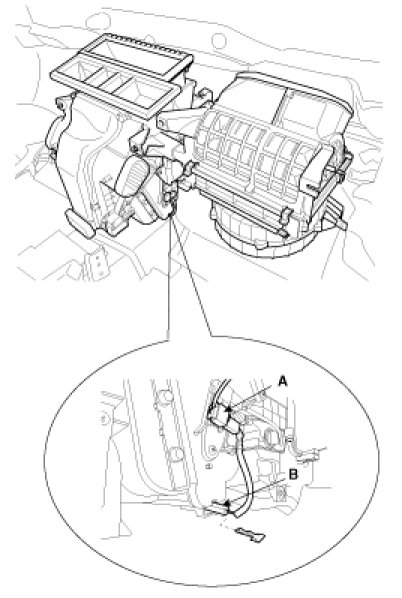 4. Disconnect the connector (A) of water temperature sensor(B) and then remove the water temperature sensor by pulling out.