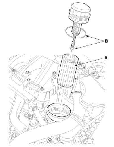 E. Install a new oil filter element(A) and two new O-rings(B).