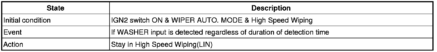 In IGN2 ON state, if AUTO switch input (LIN Communication) is ON then both Low Speed Wiping (LIN COMMUNICATION) and High Speed Wiping (LIN COMMUNICATION) are controlled by the RAIN SENSOR INPUT signal.