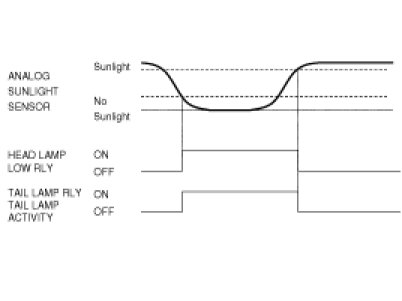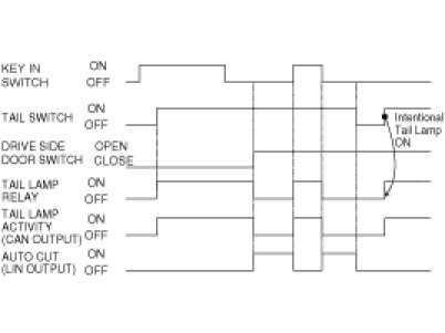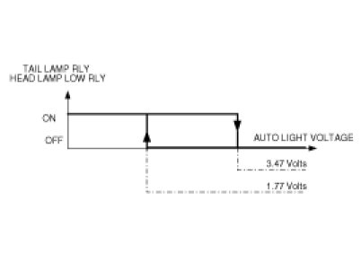 In the state of IGN1 ON and IGN2 ON, when MULTI FUNCTION switch module detects AUTO LIGHT switch ON, TAIL LAMP RELAY output and HEAD LAMP LOW RELAY output are controlled according to AUTO LIGHT Sensor's INPUT. In the state of IGN1 ON, when MULTI FUNCTION switch module detects AUTO LIGHT switch ON, TAIL LAMP RELAY output is controlled according to AUTO LIGHT Sensor's INPUT.