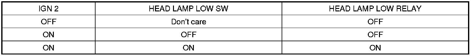 In IGN2 ON State, if there is HEAD LAMP LOW SW input (LIN COMMUNICATION), HEADLAMP LOW RELAY OUTPUT is turned ON.