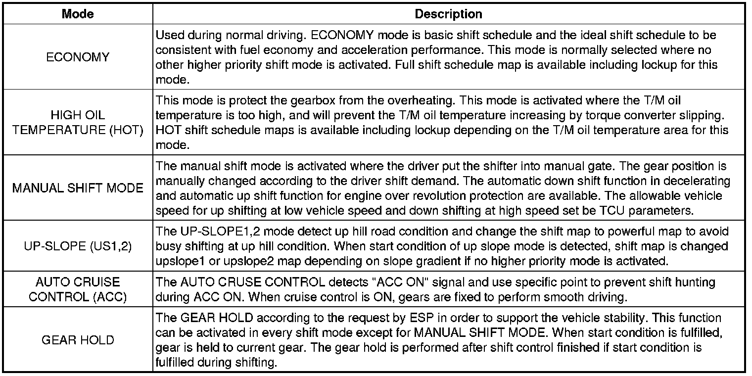 The F21 for HMC does not have a driving mode selection switch that allows drivers to select a mode themselves. The vehicle is ordinarily in economy mode. However, when specific conditions are met, the TCU selects a shifting pattern appropriate to driving conditions from all of the shifting patterns and switches automatically.