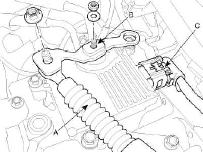 4. Install the shift cable (A), the manual lever (B), and the connector (C).