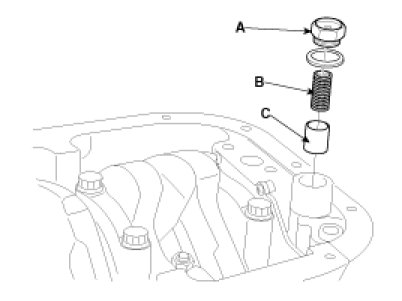 Install relief plunger(C) and spring(B) into the front case hole, and install the plug(A).