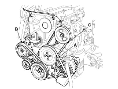 2. Inspect the tensioner pulley and the idler pulley for easy and smooth rotation and check for play or noise.