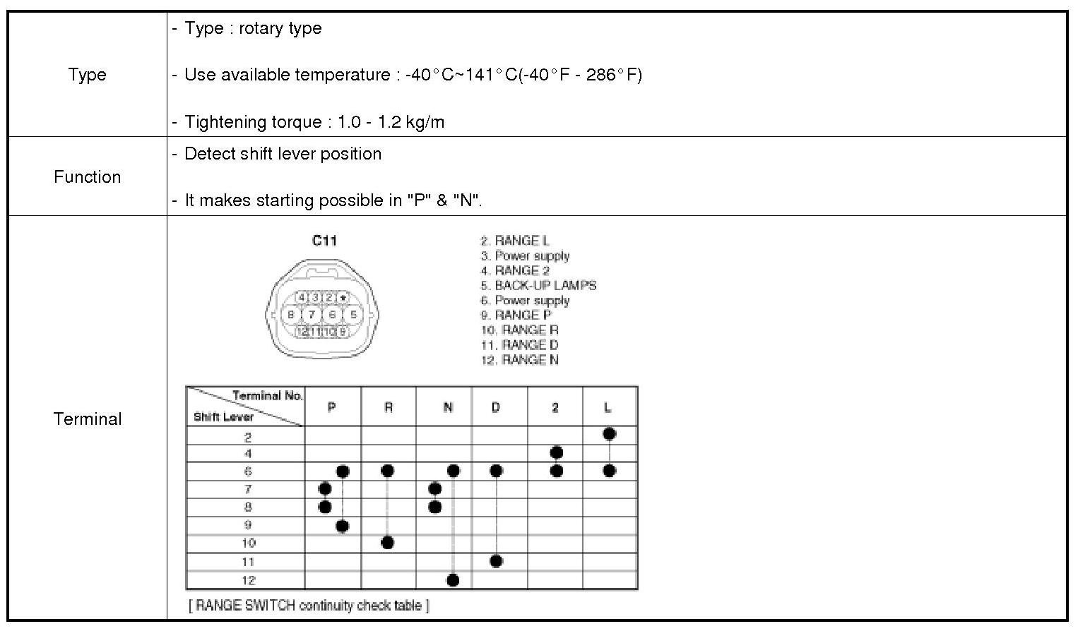 When the selector lever is in the position other than "P" or "N", the electrical circuit for starting the engine is kept in the OFF state by the inhibitor switch. Therefore, the engine does not start even if the ignition switch is turned to the "START" position. Inhibitor switch is installed on the transaxle case located at the upper end of the manual control shaft and is interlocked with the manual control lever.