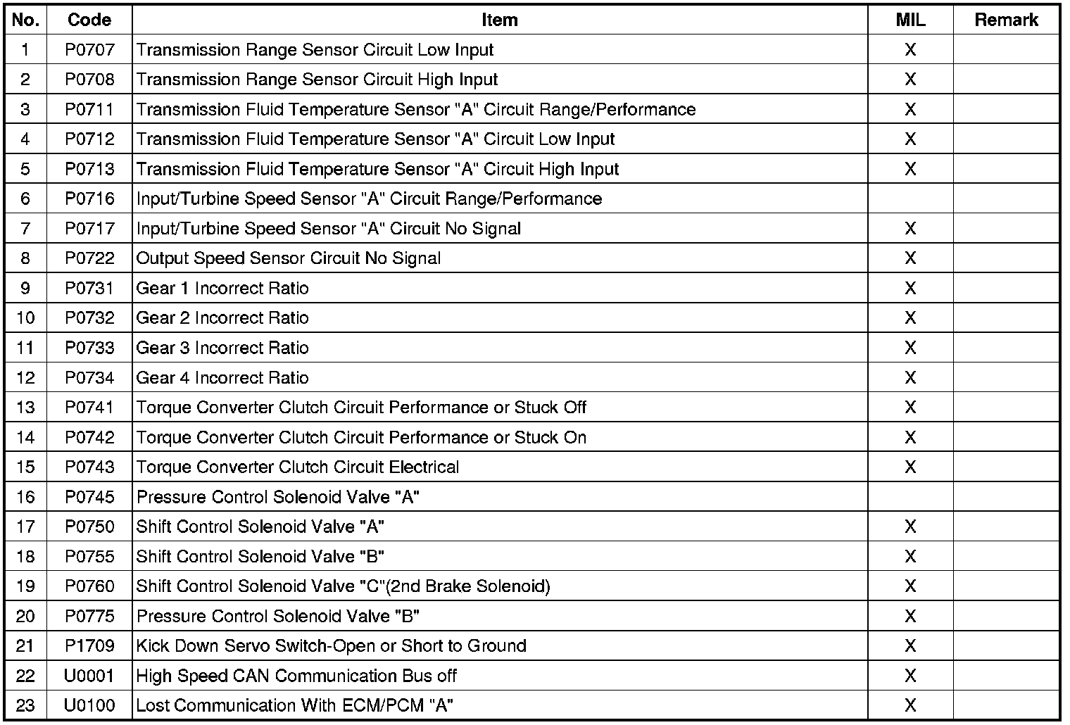 Diagnostic Trouble Code Table