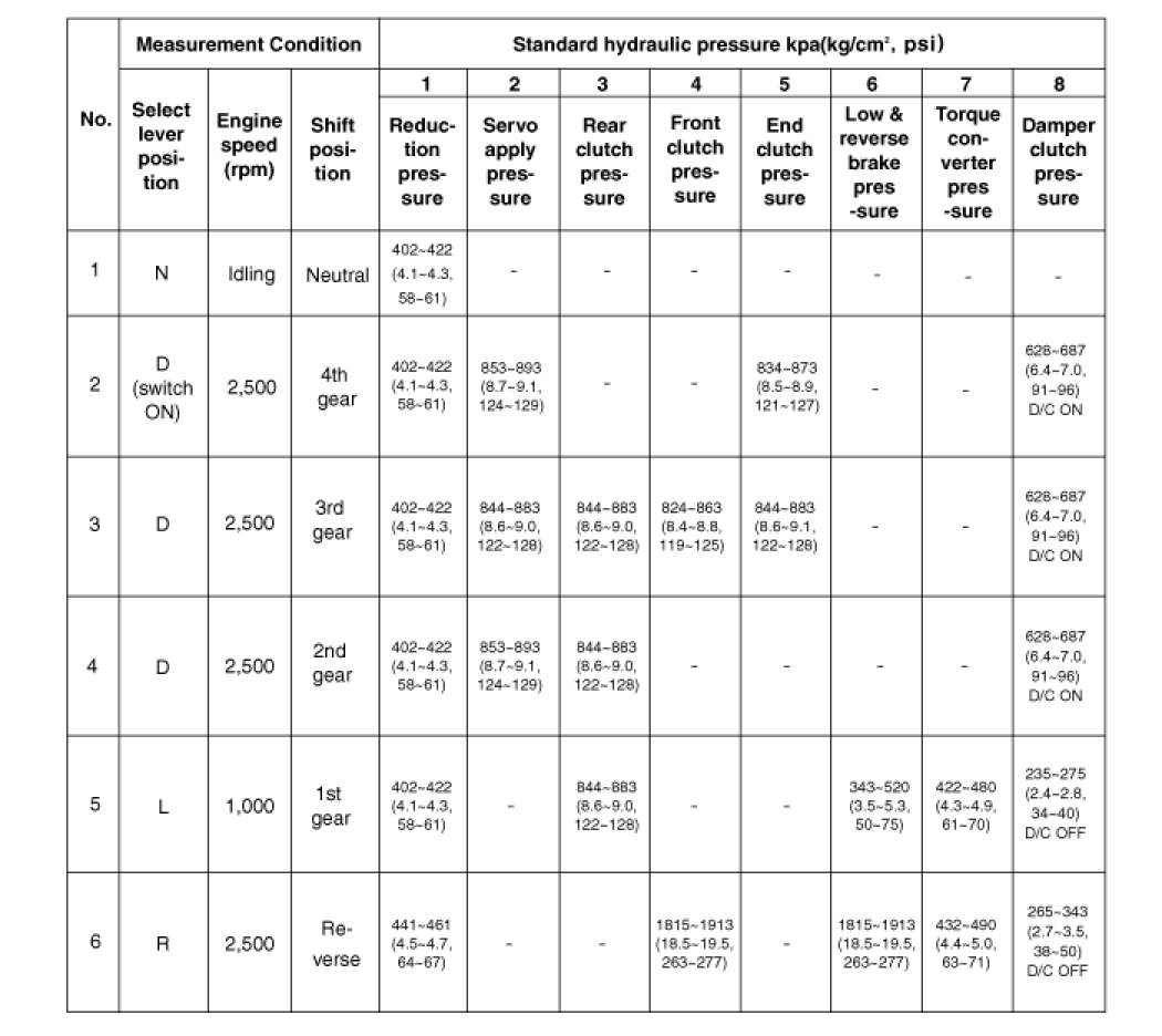 5. If a value is outside the standard range, correct the problem while referring to the hydraulic pressure test diagnosis table.