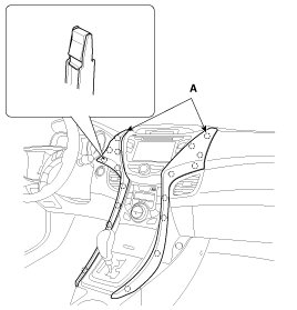 1. Using a screwdriver or remover, remove the crash pad center garnish (A).