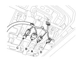 3. Disconnect the buckle (A), seat warmer (B), SAB (C), WCS (D) connectors.