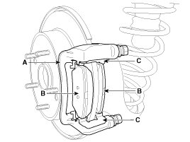 1. Check the pad wear. Measure the pad thickness and replace it, if it is less than the specified value.