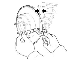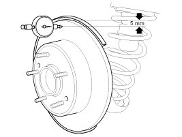 1. Place a dial gauge about 5mm (0.2 in.) from the outer circumference of the brake disc, and measure the runout of the disc.