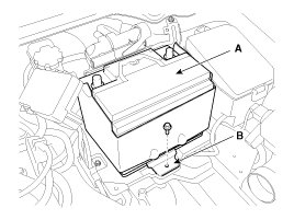 6. Loosen the battery "+" cable bracket mounting bolt (A) and then remove the battery tray (B).