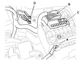 15. Disconnect the "+" cable (A), the fuse box connector (B) and the EMS block (C) from the fuse/relay box and then remove the wiring protector after disconnecting the ground lines (D).